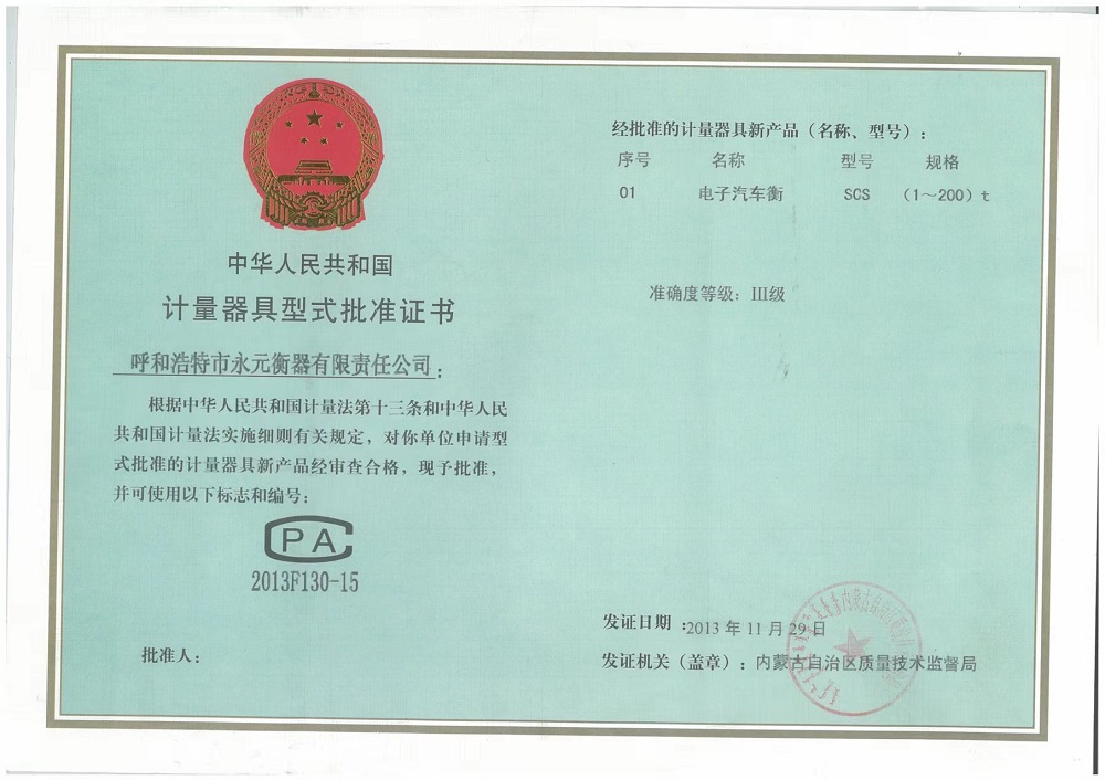 計(jì)量器具型式批準(zhǔn)證書(shū)