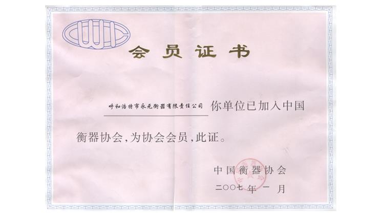 中國(guó)衡器協(xié)會(huì)會(huì)員證書